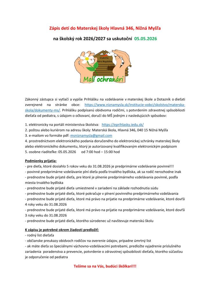 Pozývame Vás na zápis detí do našej Materskej školy, ktorý sa uskutoční 5.5.2026. Tešíme sa na nové tváre.